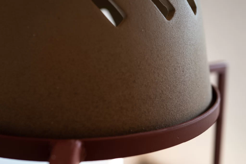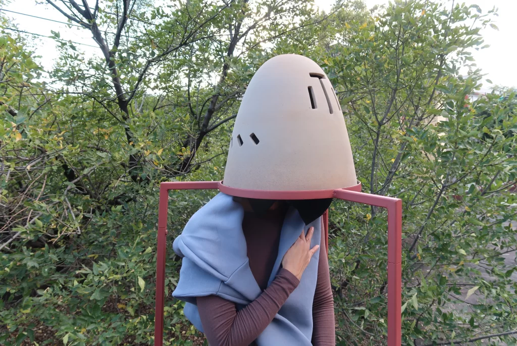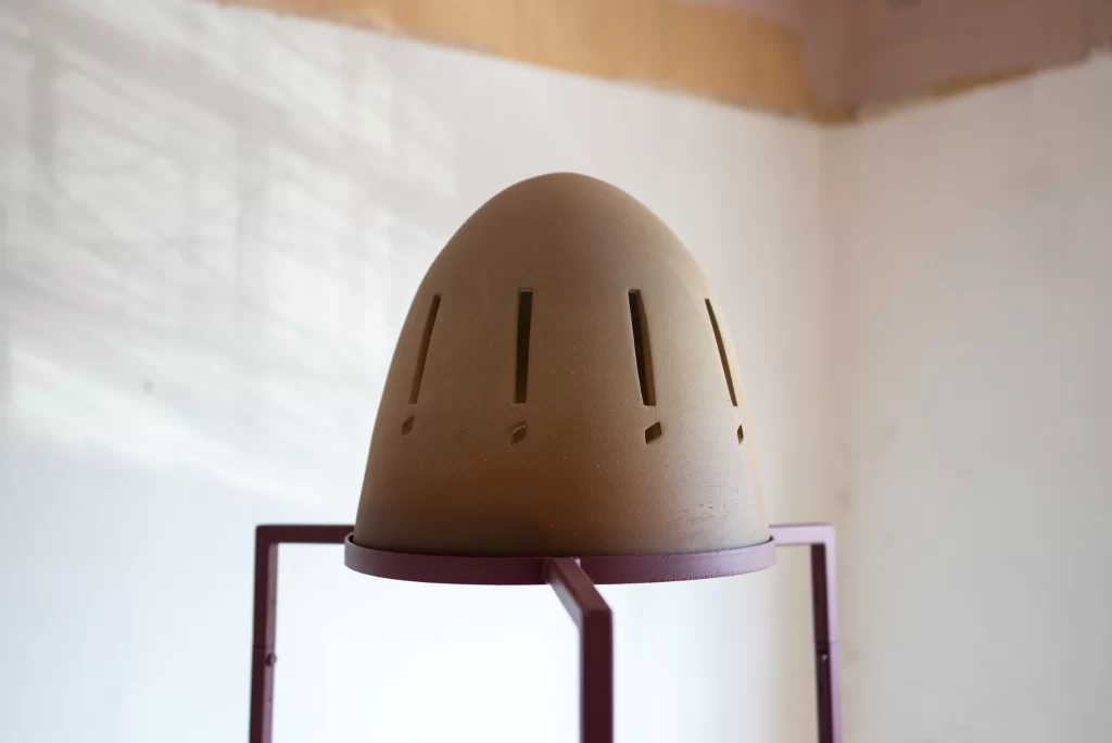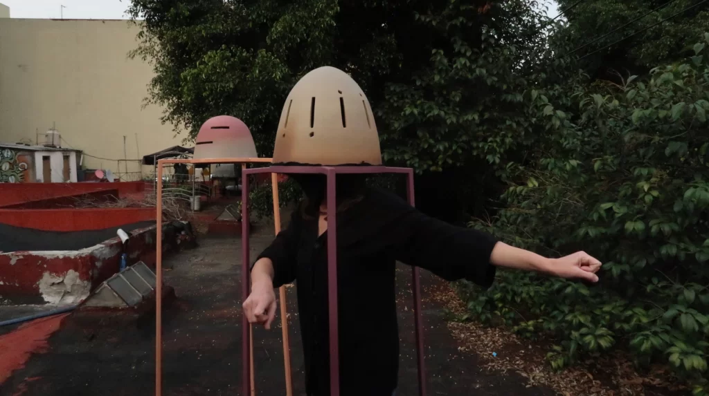 En 2021, proyecté una serie de esculturas en cerámica, nombrada “El aire está en movimiento y nosotres también, dispositivos de escucha”. Estas piezas, una especie de cascos sobre estructuras metálicas, fueron imaginadas para ser habitadas y experienciadas a través de una sesión guiada de escucha. Concebidas para manifestar las múltiples cualidades sonoras del viento —chiflidos agudos, ritmos intermitentes, pausados o frenéticos—, buscaban revelar la diversidad de su presencia sonora. Para el desarrollo y confección de estas esculturas, invité al escultor y ceramista xalapeño Pablo Muñoz a colaborar, poniendo a prueba las piezas y escuchando los soplidos. Jugué con el espesor y las formas de los surcos en la superficie, produciendo cajas de resonancia, explorando diferentes acabados en el material y combinando elementos para provocar sonoridades particulares o producir una escucha específica, como lo entiende el músico e investigador mexicano Tito Rivas en relación con los dispositivos sonoros[1].