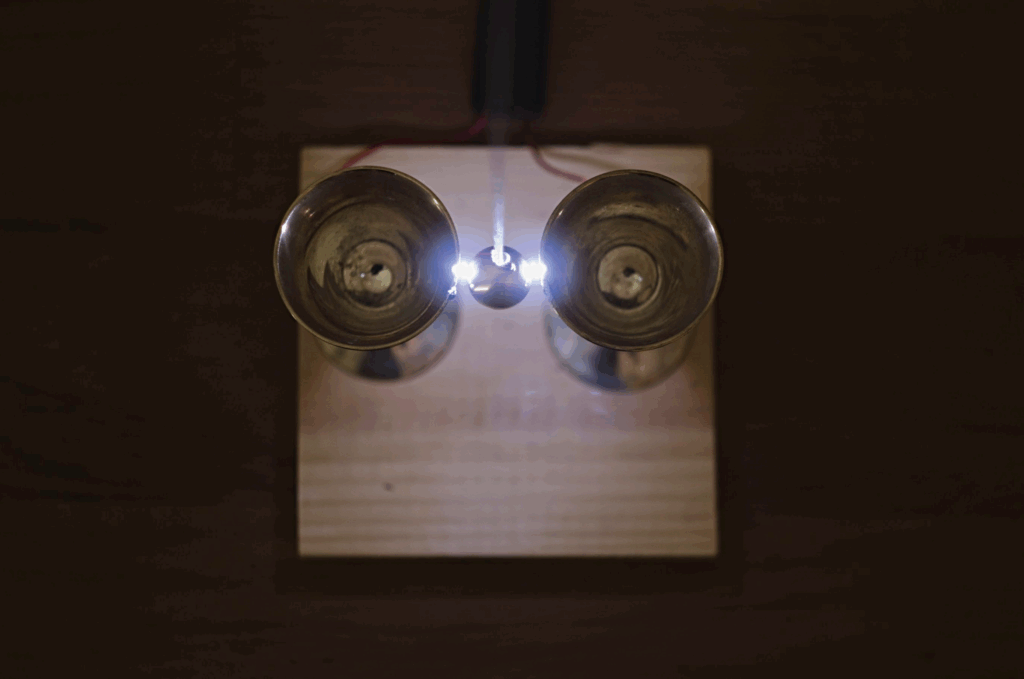 Usando dos copas compradas en el mercado de antigüedades de la Plaza O’Higgins, una cuerda, una pequeña campana del megamercado chino y un generador Marx, creé una Campana de Franklin. Este antiguo dispositivo electrónico demuestra el comportamiento del alto voltaje y la atracción electrostática: cuando dos terminales se cargan con alto voltaje, un objeto conductor suspendido entre ellas empieza a oscilar. Al balancearse, suelen aparecer chispas de alta frecuencia que liberan ráfagas de electromagnetismo en el espacio circundante.