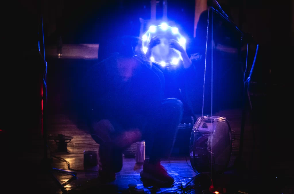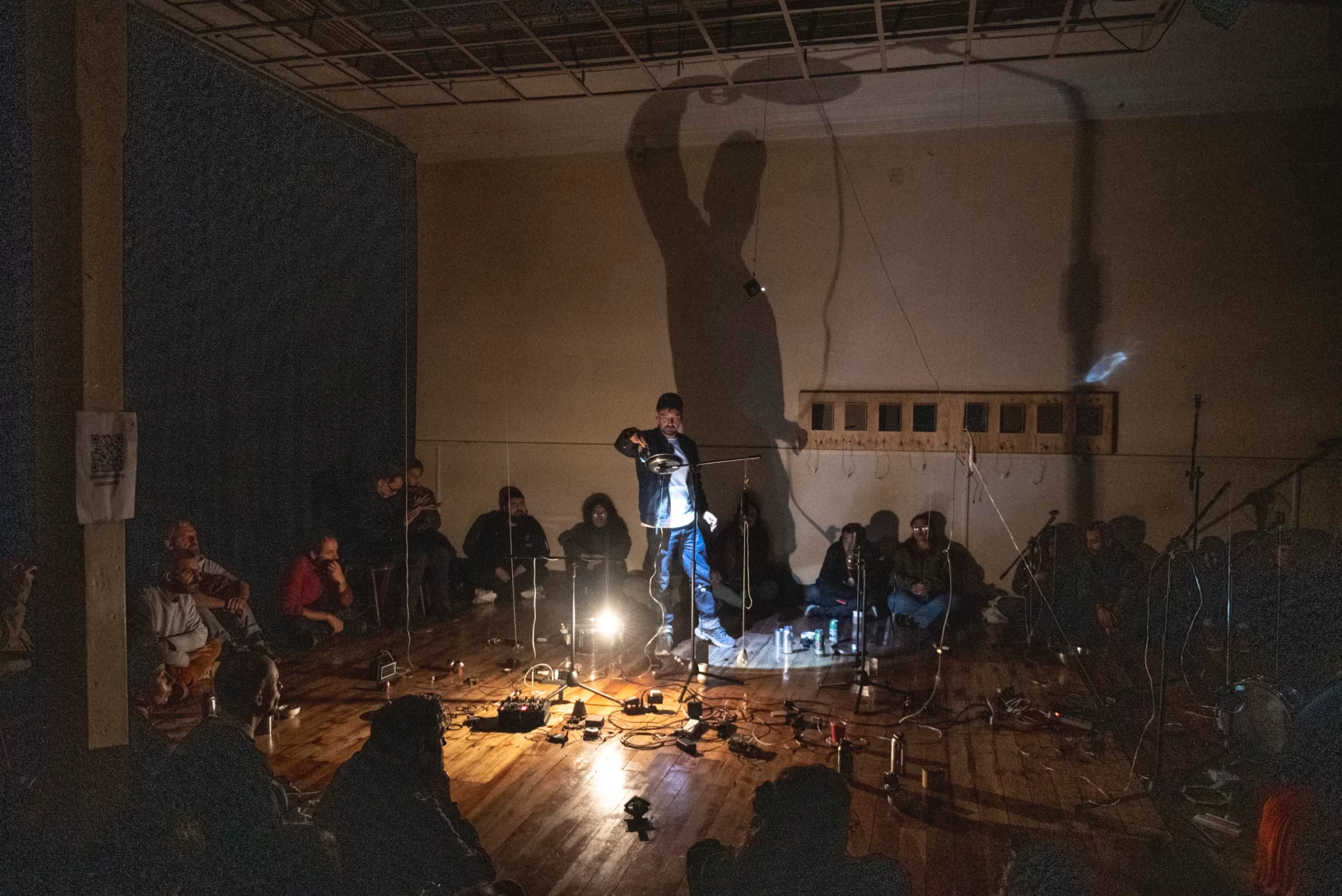 En colaboración con Fernando Godoy y Bárbara González, realizamos una improvisación colectiva con luz, sonido y objetos cinéticos en Espacio Prat. Esta instancia me permitió probar algunos de los nuevos dispositivos desarrollados durante la residencia, entre ellos brechas de chispa mejoradas, campanas de Franklin, máquinas de resonancia magnética, altavoces giratorios y una campana que encontré en el mercado de antigüedades de la Plaza O’Higgins.