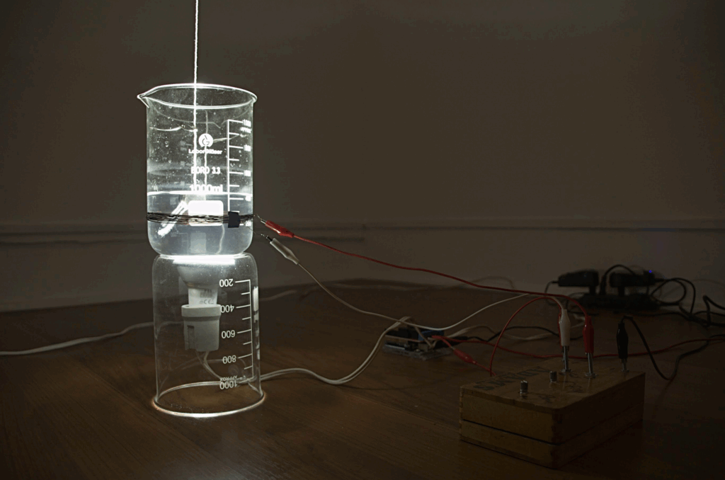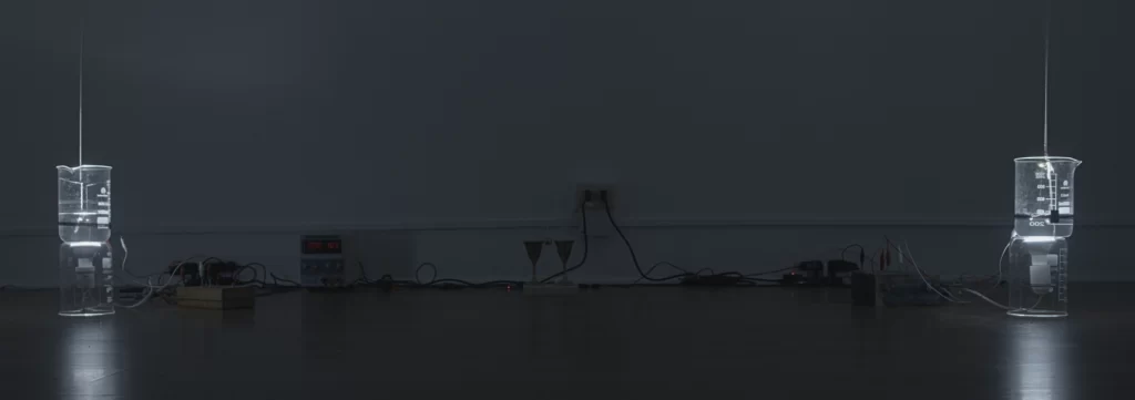 Tras días de experimentación y múltiples recorridos por tiendas en busca de los imanes adecuados (que nunca encontré), desarrollé un circuito y un mecanismo donde un imán suspendido se mueve de manera intrigante dentro del agua. Al iluminar el líquido desde abajo, la luz refractada se proyecta sobre las paredes circundantes. Elegí recipientes de vidrio de una tienda de material científico por su acústica particular y su capacidad para transmitir la luz, integrando así fenómenos sonoros y visuales en la obra.